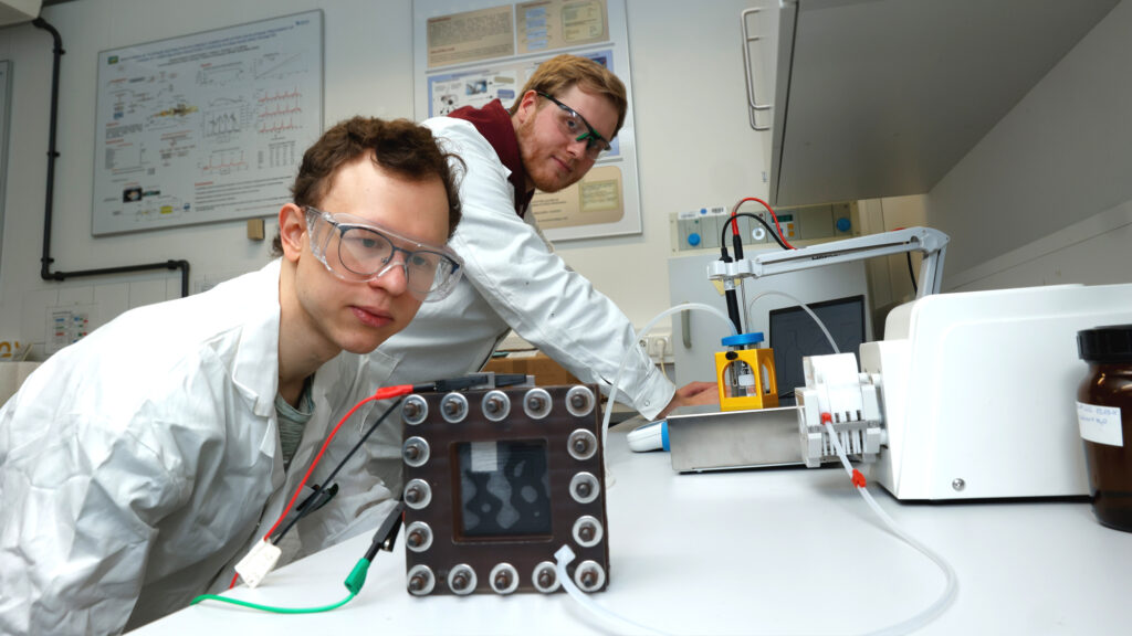 Andreas Kuhlmann (left) and Marten Huck test a reactor for silicon extraction on a laboratory scale. Photo: Forschungszentrum Jülich/Jansen