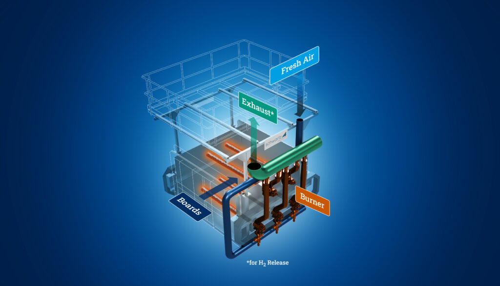 The heat treatment systems used by the schwartz Group heat the plates indirectly. The burner flame heats a metal pipe from the inside, which then transfers the heat to the steel plate via the outside. The hot exhaust gas exits the pipe without coming into contact with the plates. “We want to use the energy contained in the exhaust gas for the process of releasing hydrogen from the larger molecule,” says Philipp Morsch, who coordinates the scientific support for the INW. Temperatures of at least 290°C are necessary to release hydrogen from the carrier molecule. To this end, the previously unused waste heat is to be integrated.