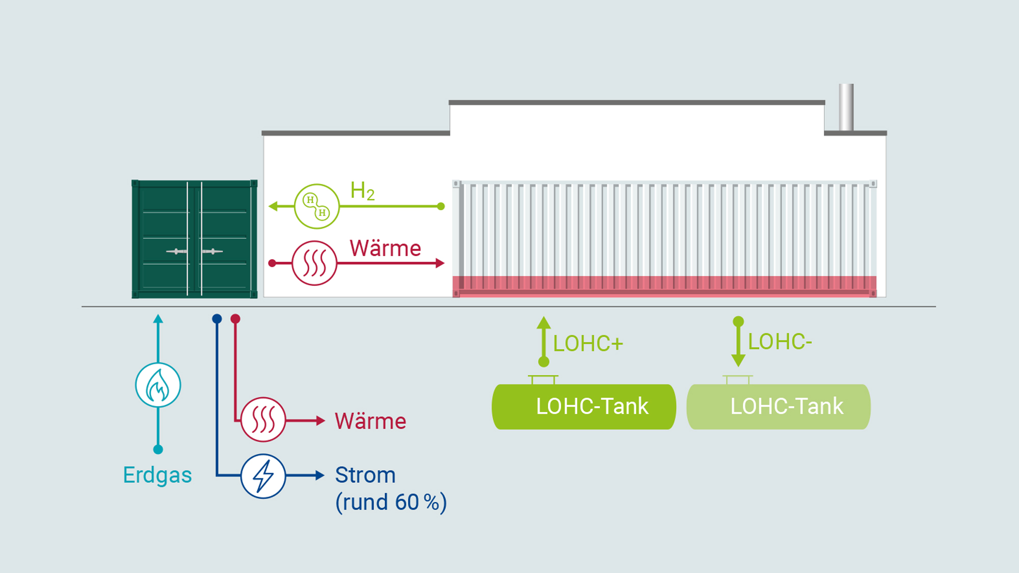 Die Energiezentrale wird neu aufgesetzt mit einem SOFC-System (links) und der LOHC-Technologie.