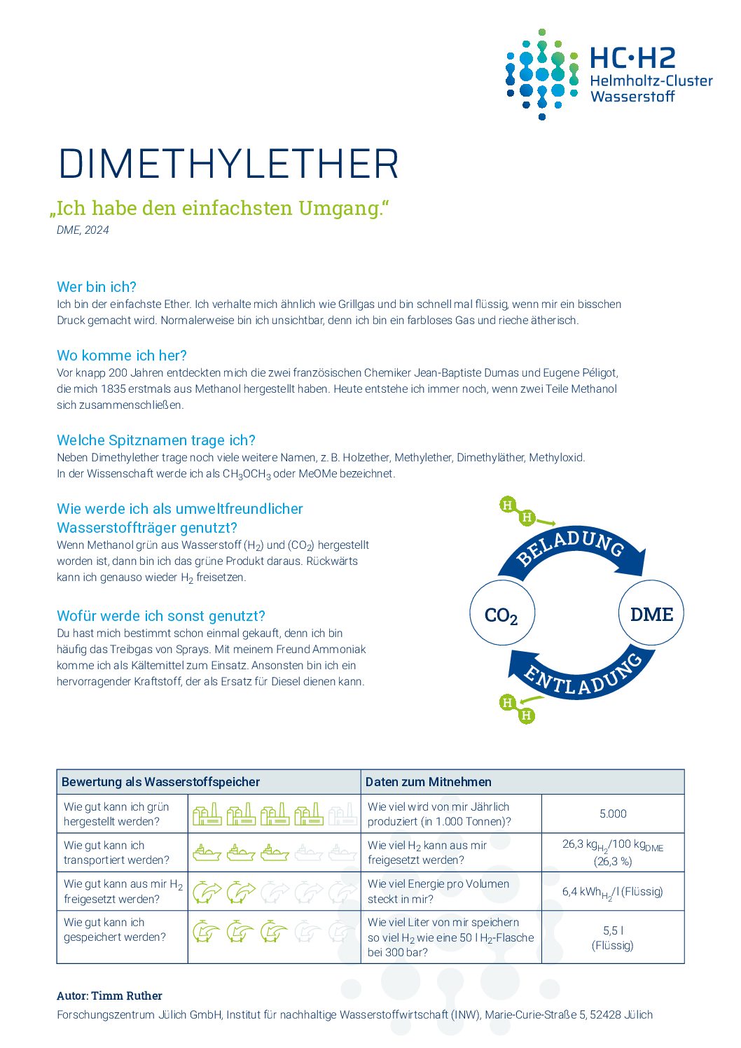 Das INW konzentriert sich wie gesagt auf chemische Speichermethoden unter anderem, weil der Energieaufwand für das Speichern meistens niedriger ist als bei physikalischen Methoden. Aber auch die chemischen Speicher stellen Ansprüche. In dieser Serie stellen wir die chemischen Speicher, die unsere Forscherinnen und Forscher beschäftigen, mit Steckbriefen vor. Den Auftakt mach Dimethylether, kurz DME, das viele als den Trägerstoff in Sprühdeos kennen. In der Flasche unter geringem Druck ist es flüssig. Wird der Sprühkopf gedrückt, entweicht DME als Gas und transportiert den Duftstoff an die gewünschte Stelle.
